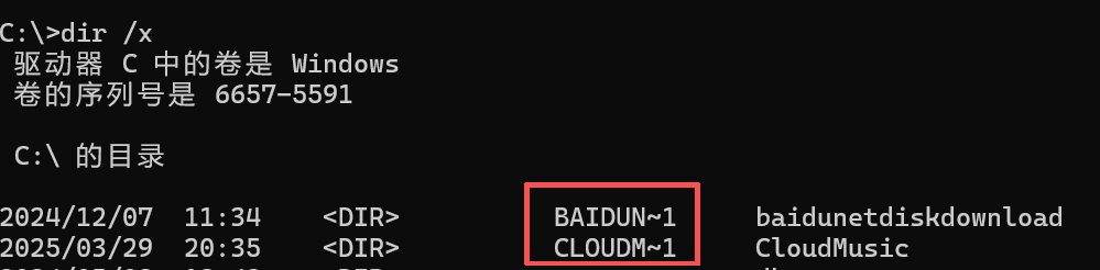 为了兼容16位MS-DOS程序,windows为文件名较长的文件(和文件夹)生成了对应的windows 8.3短文件名下在windows下查看对应的短文件名,可以使用命令 dir /x