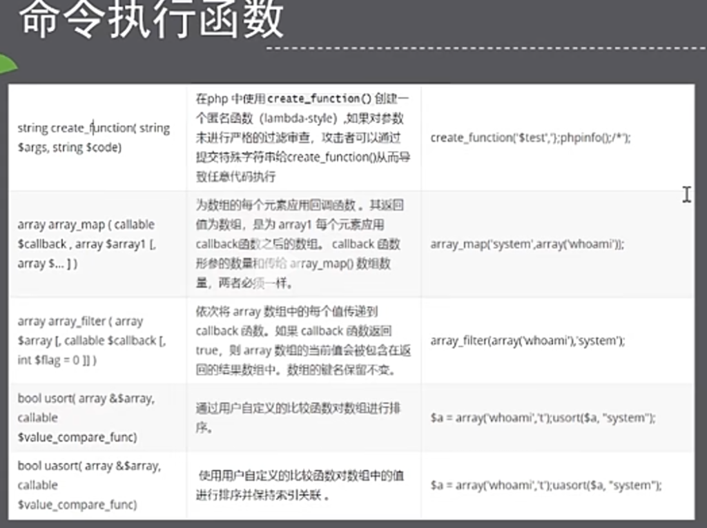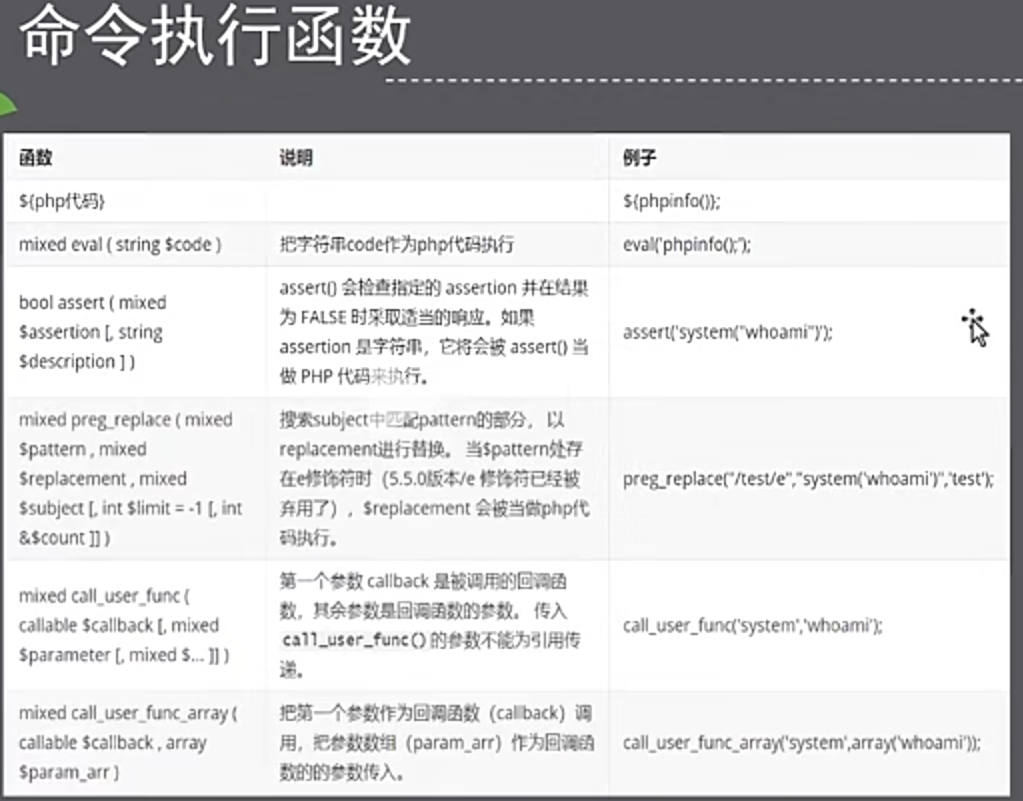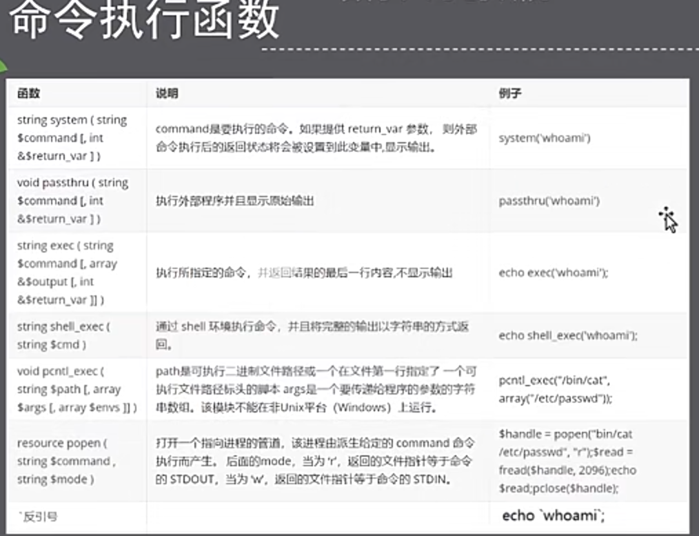 system、exec(回显)、shell_exec(不回显)、passthru、popen、proc_popen等